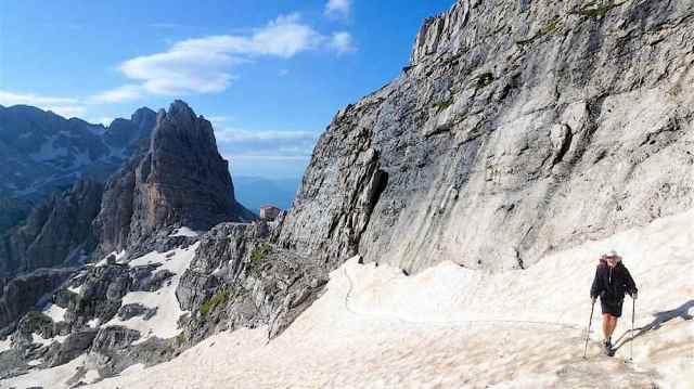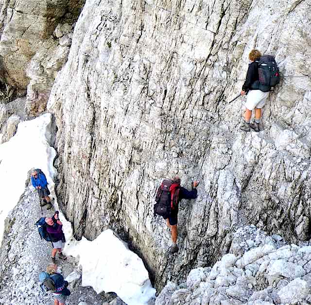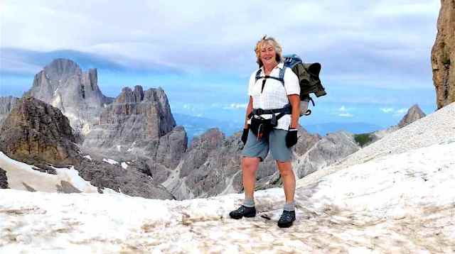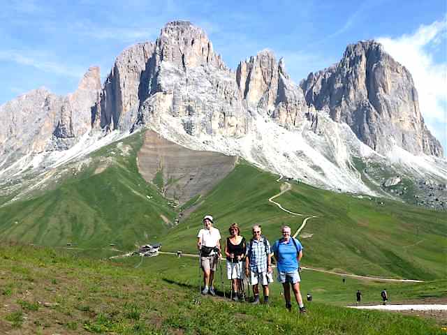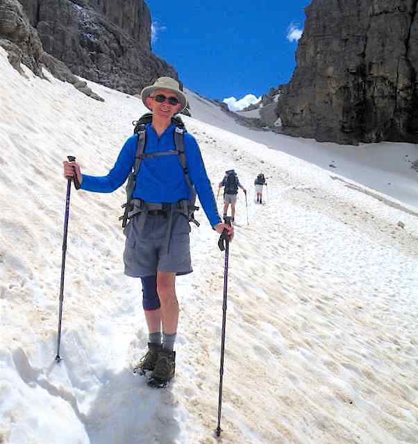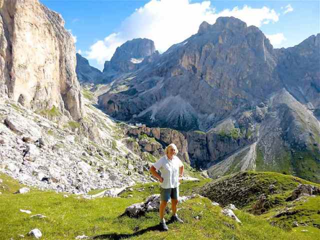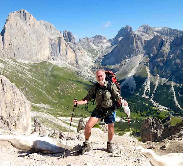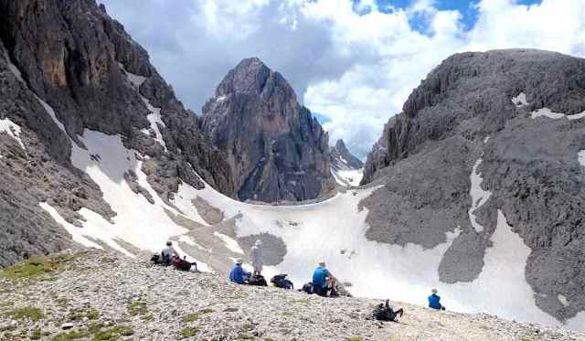 The route was in two separate parts, the first of which was a 5-day section which looped its way through the Sciliar and Catinaccio groups, followed by a day excursion along the flanks of the Sassolungo group on the north side of Val di Fassa. After a bus transfer from Canazei to Andalo, the second section was a 3-day circular loop through the Brenta group, climbing through the Bocca di Brenta and returning to Andalo via Passo Grostè. With few Dolomite summits accessible to walkers, the only ones climbed were the minor peak of Monte Pez (2563) above the Bolzano hut, and the rock outcrop of Ciampaz (2316 m) near the Roda di Vael hut. The highest point reached was Passo d’Antermoia (2770).